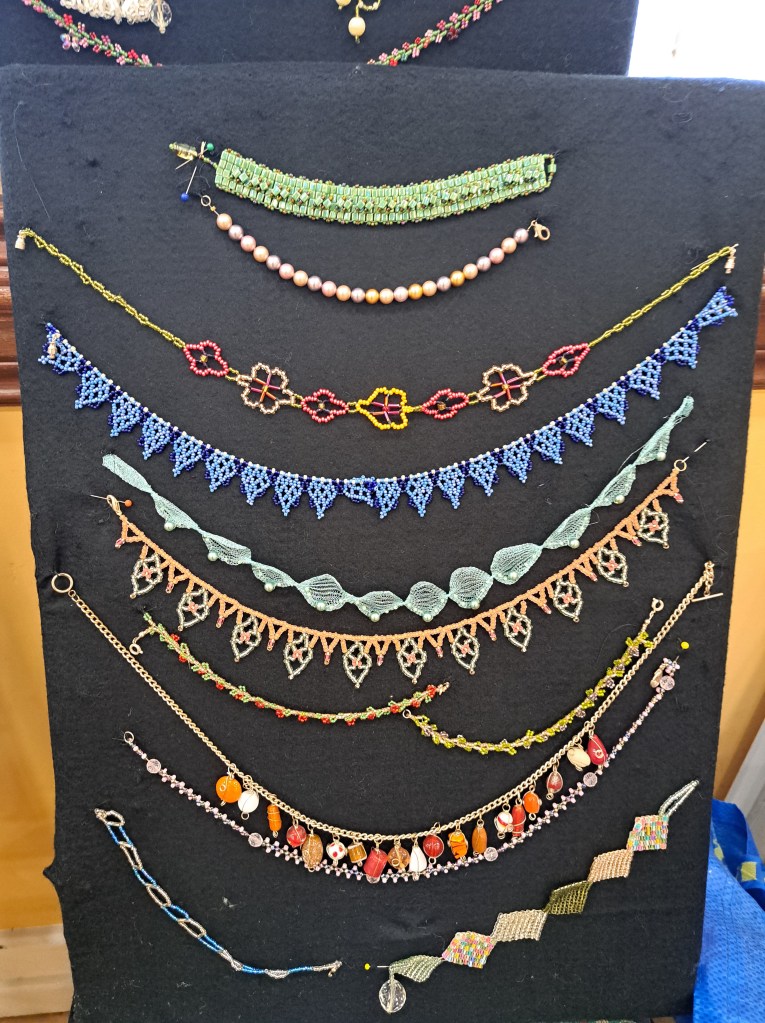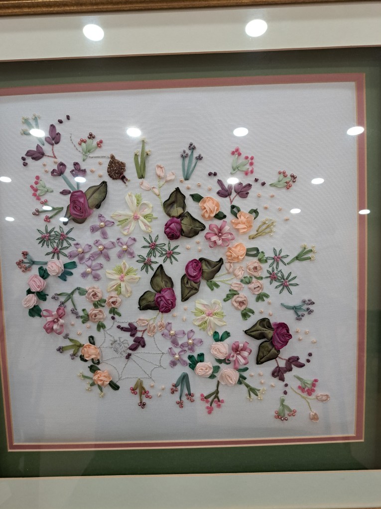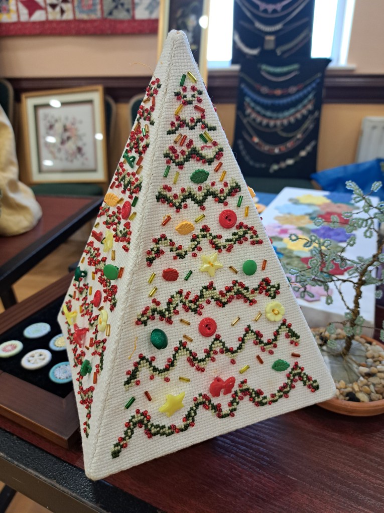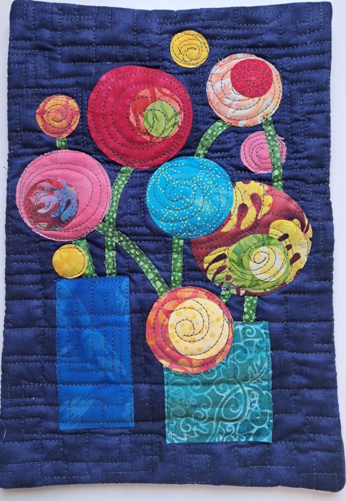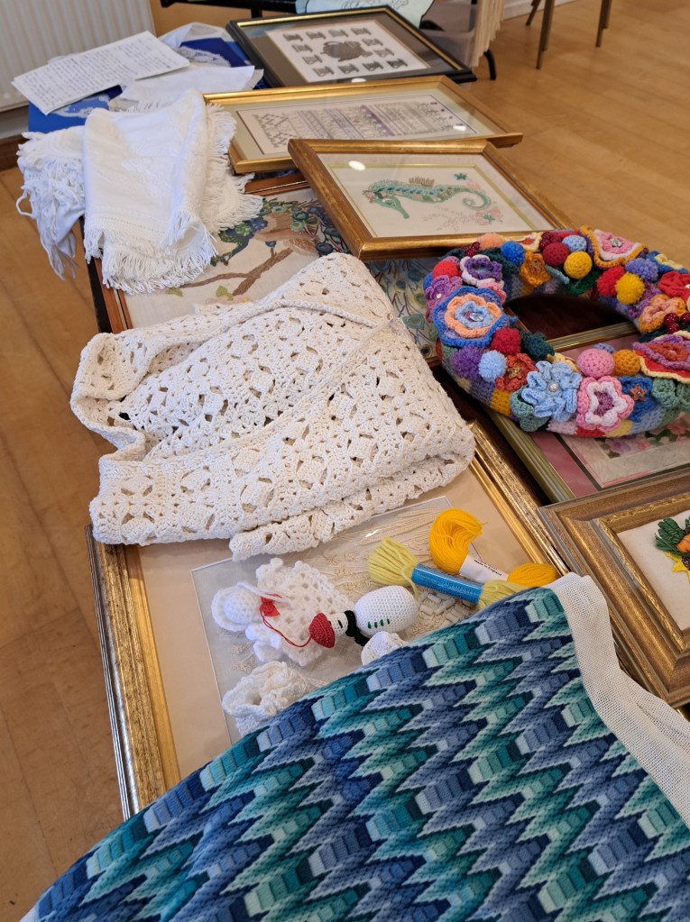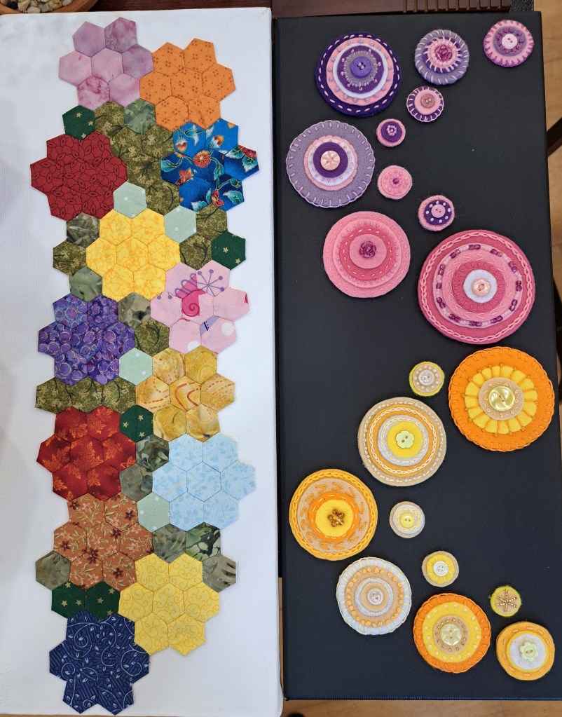 Our guessed speaker this month was Julia Zagar, who is a Cork based textile artist. She bought along some of her work that spanned a wide range of techniques all with here clear understanding of nature and a talent for using multiple different mediums to create both pictural and 3D work. 15 years ago she completed a Art Quilts workshop, with her first work a collage Cockrel. From the beginning Julia understood the importance of colour and used colour theory as a key element as she constructs her pieces. Compiling a fabric stash from charity shop clothing she incorporates texture and pattern in a layering effect that gives her work great depth. During covid Julia committed to making a postcard sized piece of handstitched work every day. This resulted in an amazing collection of work which was displayed on six double sided sheets. Other items on display included work using Suffolk puff circles. A self portrait and abstract work inspired by nature.
