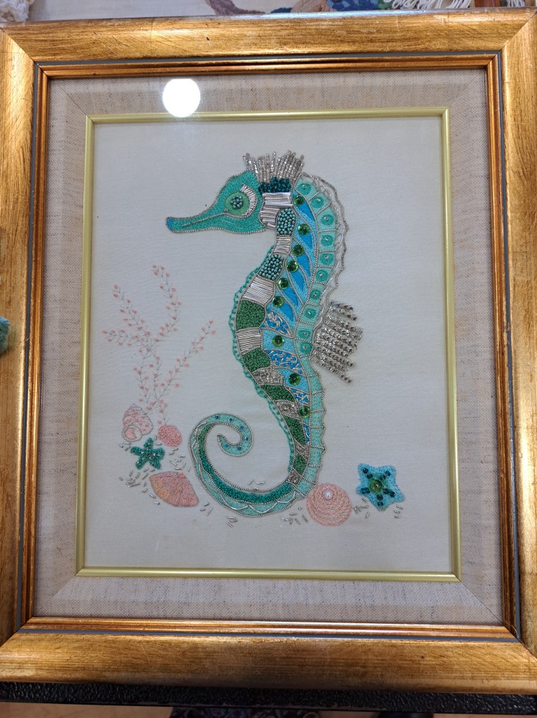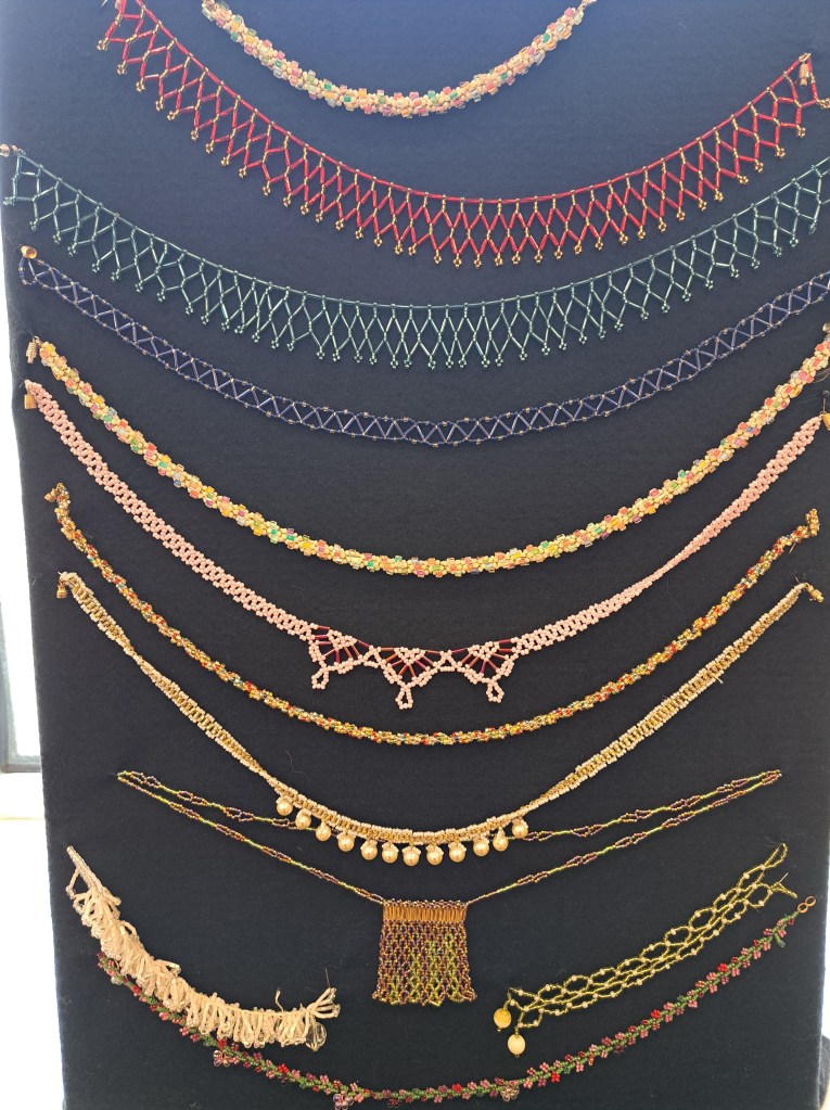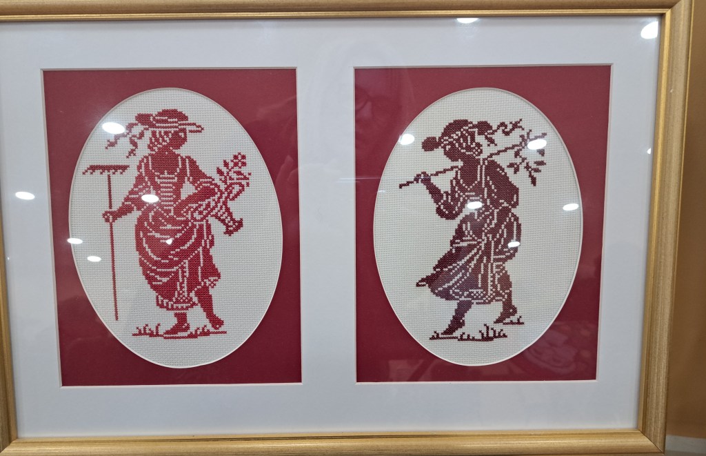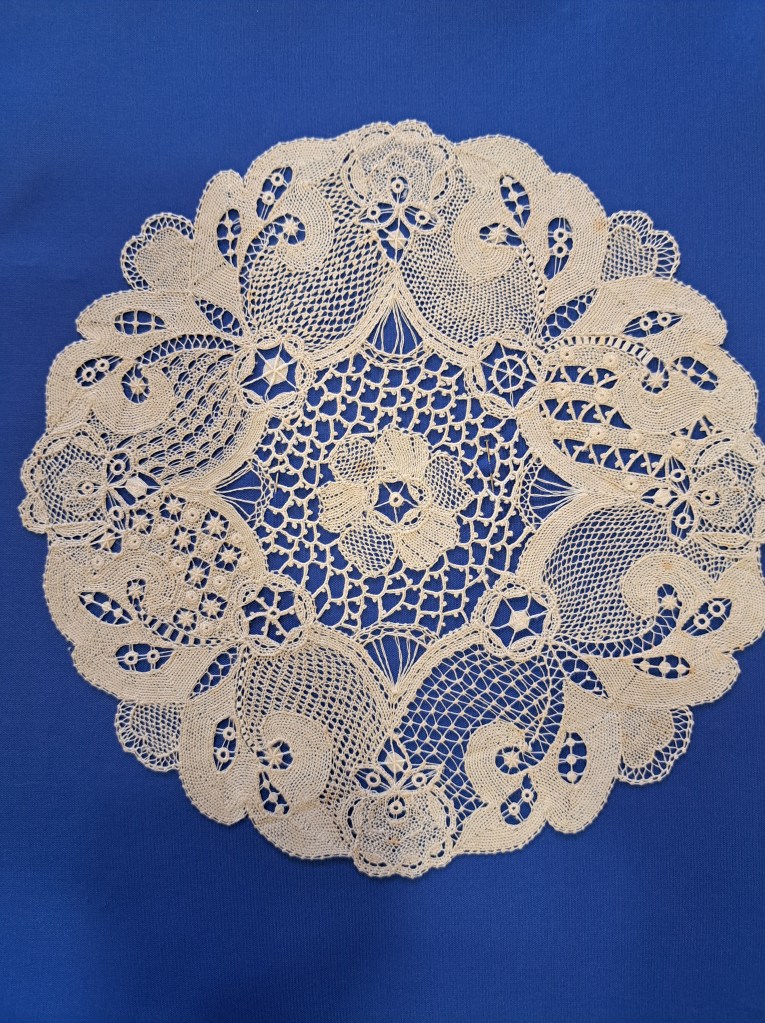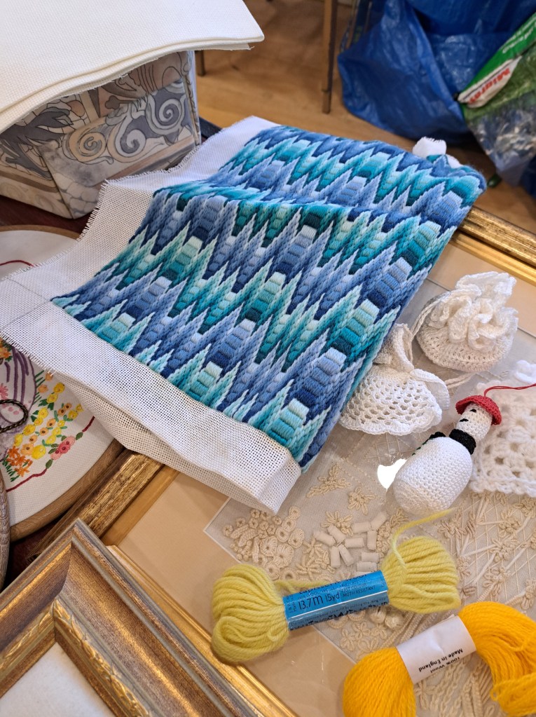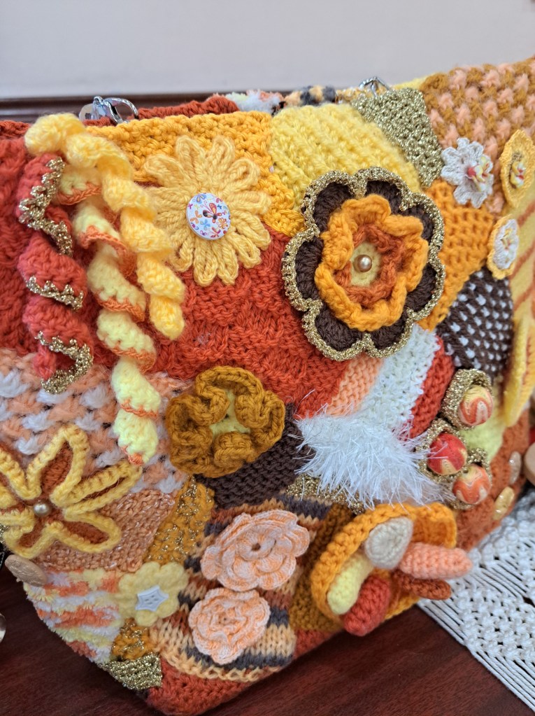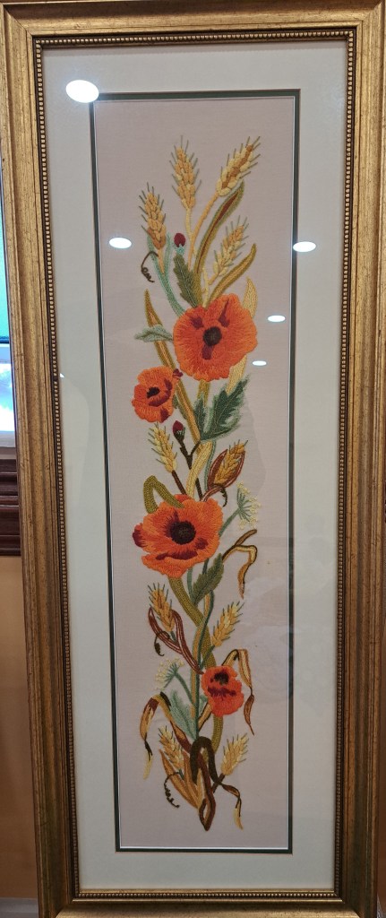 Our guessed speaker this month was Julia Zagar, who is a Cork based textile artist. She bought along some of her work that spanned a wide range of techniques all with here clear understanding of nature and a talent for using multiple different mediums to create both pictural and 3D work. 15 years ago she completed a Art Quilts workshop, with her first work a collage Cockrel. From the beginning Julia understood the importance of colour and used colour theory as a key element as she constructs her pieces. Compiling a fabric stash from charity shop clothing she incorporates texture and pattern in a layering effect that gives her work great depth. During covid Julia committed to making a postcard sized piece of handstitched work every day. This resulted in an amazing collection of work which was displayed on six double sided sheets. Other items on display included work using Suffolk puff circles. A self portrait and abstract work inspired by nature.