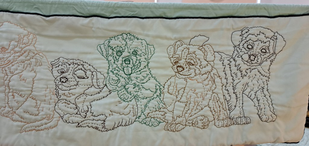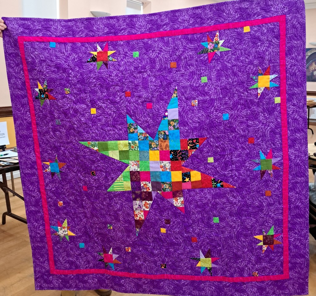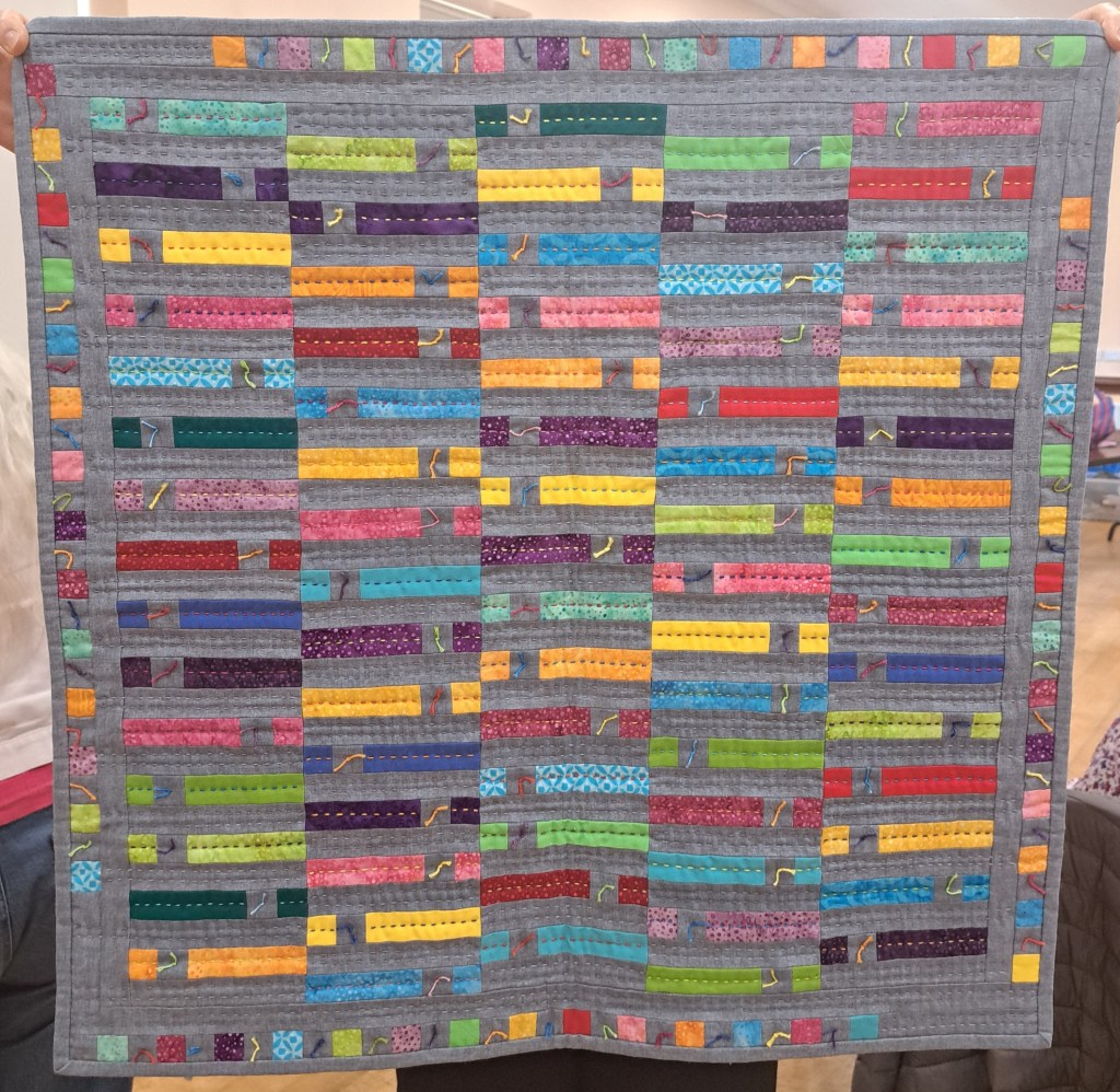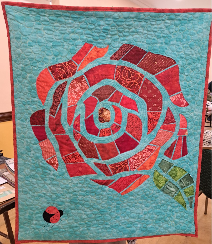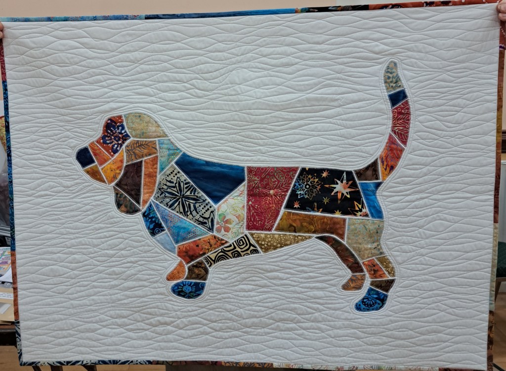 The show and tell was an animal parade that had a guest appearance from Chester the cat and we all quacked with delight at the 2 little ducks! Claire McSweeney showed her amazing quilt and Dorann had us seeing double with her pair of twin quilts which included rats as symbols of the recipients year of birth in the Chinese calendar. Ann shared her doggy panel which included the names of past and present pets quilted into the background. Clare Newell’s hexagon quilt was full of dogs. Rebecca’s hedgehog wall hanging was really cute and her night sky included bats, owls and woodland critters. Tina even brought along a highland cow.