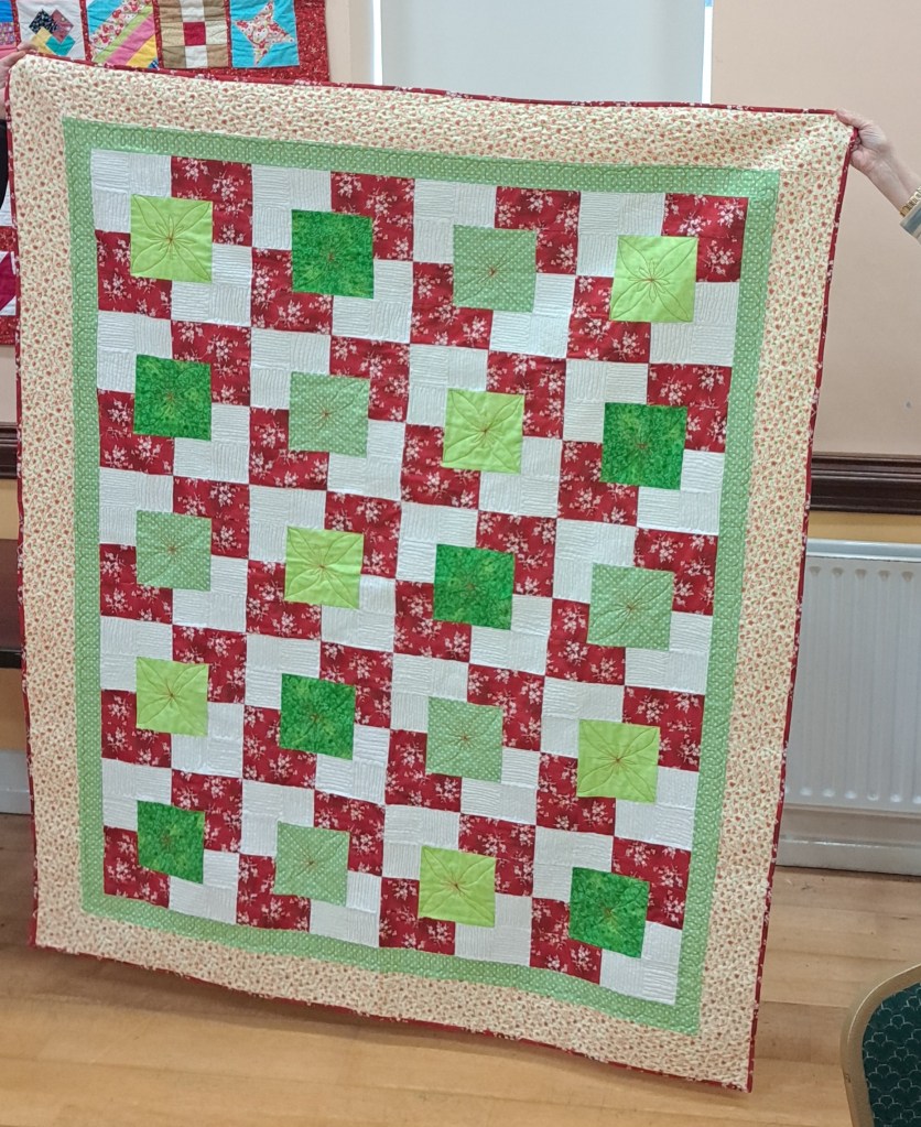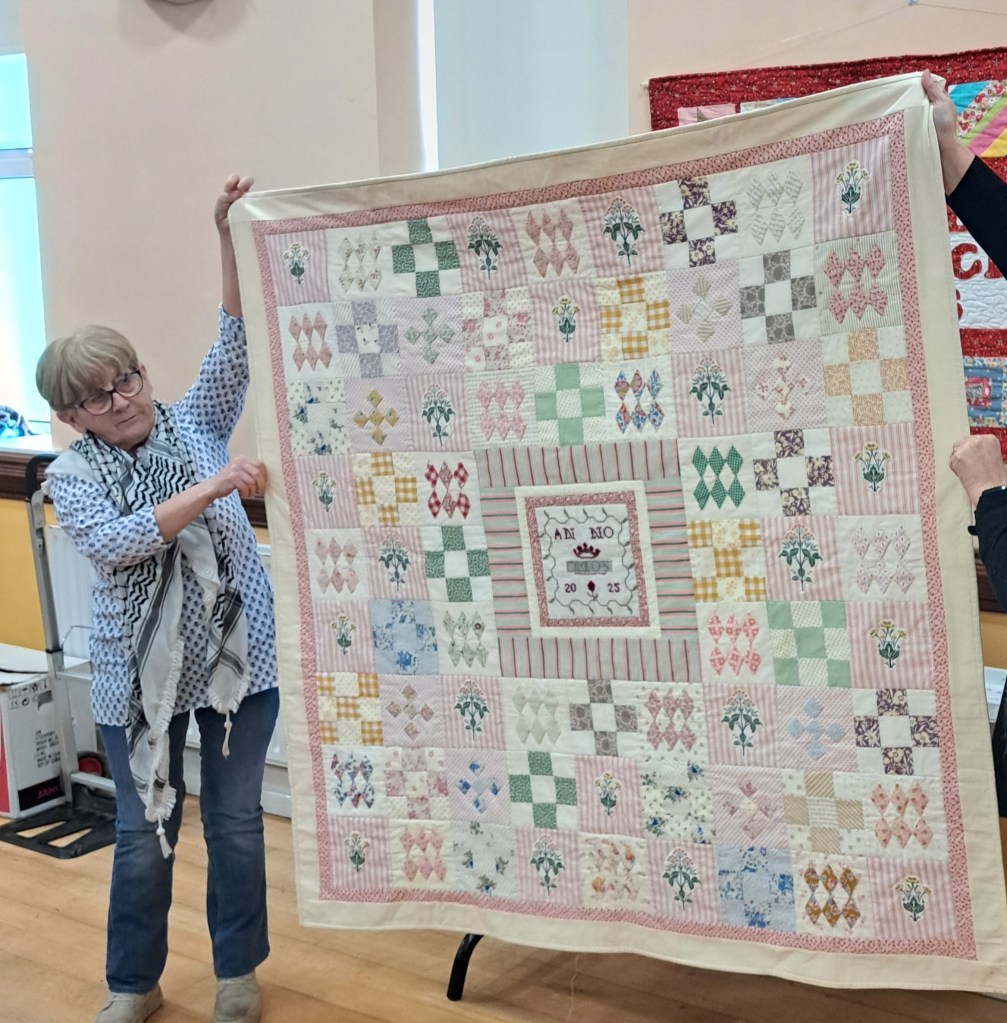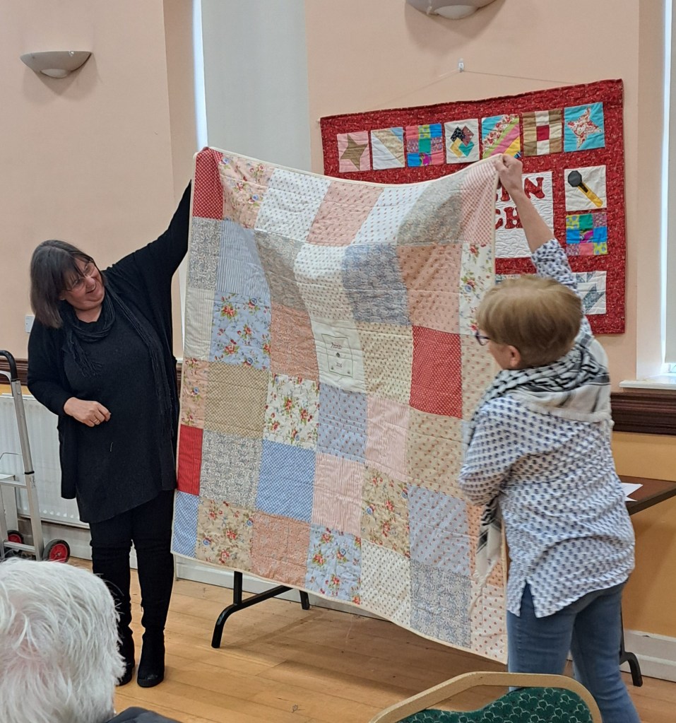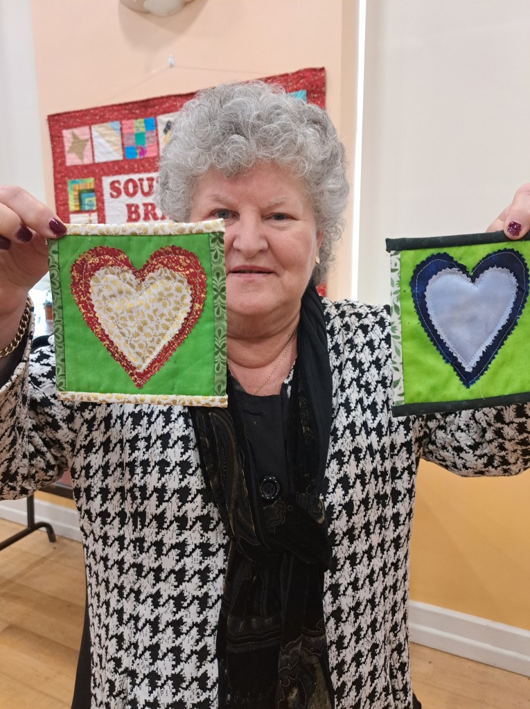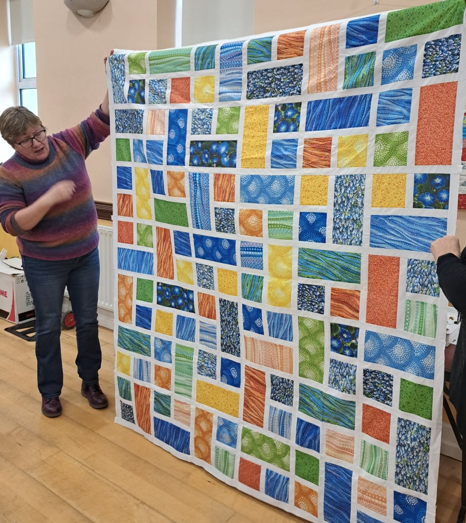 The show and tell never disappoints. Bright colours were the order of the day to banish the grey skies. Bernie showed off a vibrant shadow quilt. Eilís showed her latest layer cake quilt. Everyone was amazed at Jacinta’s wonderful hexagon quilt which was all hand stitched. Anne Maloney had a happy valentines day when she was gifted two delightful hearts.