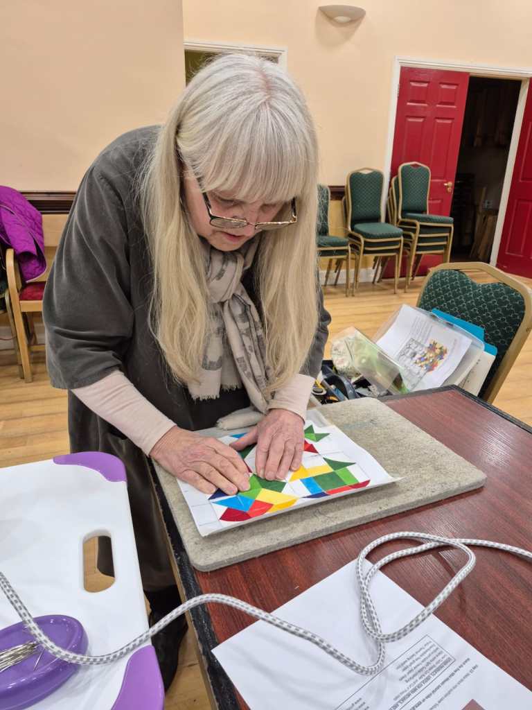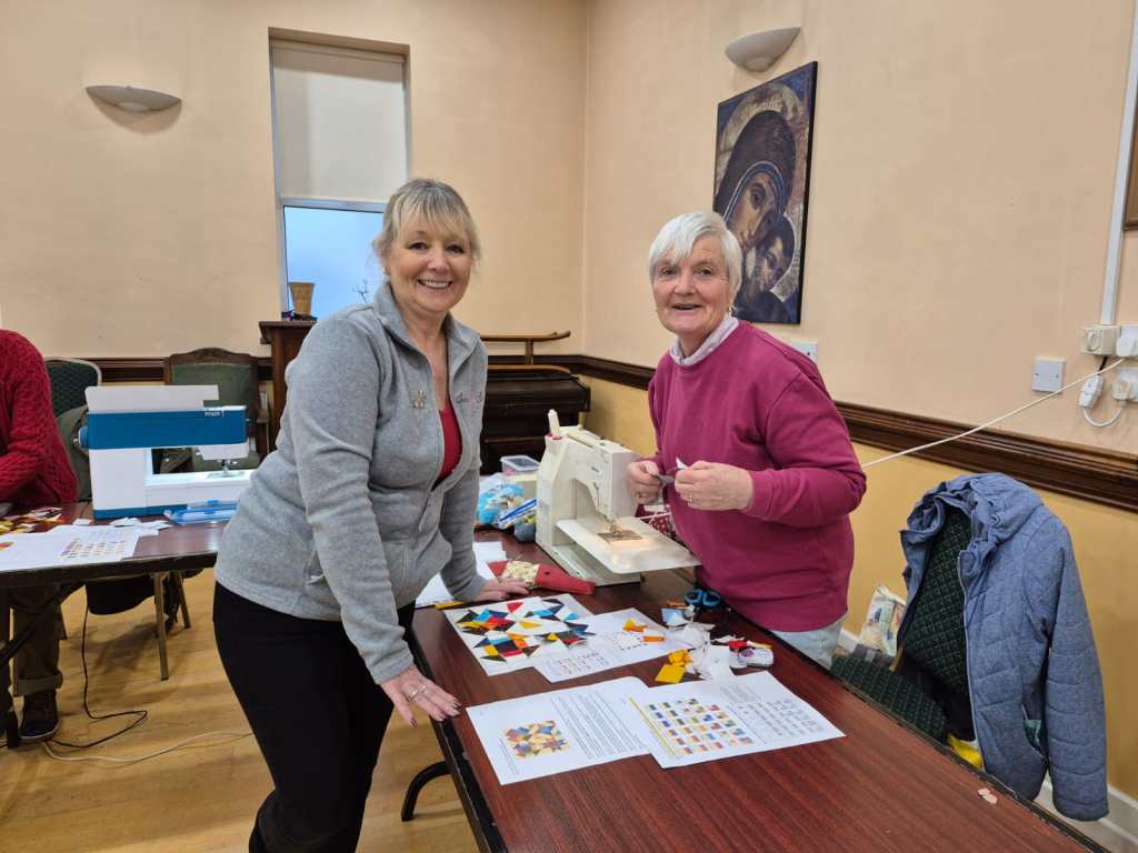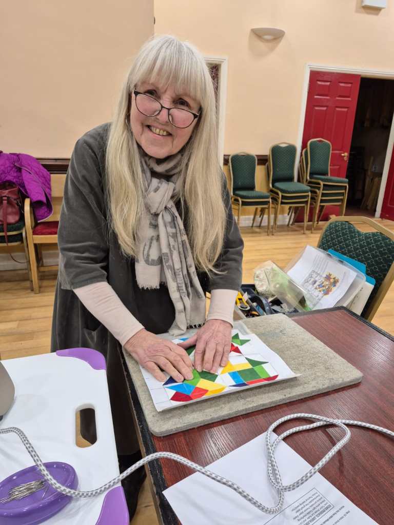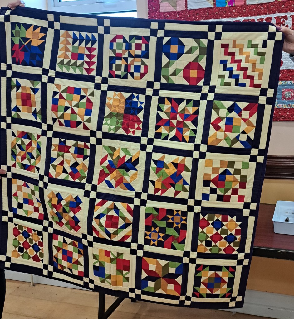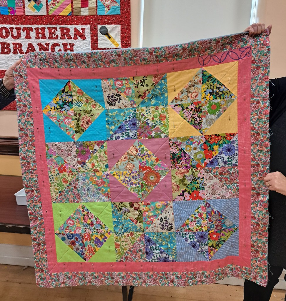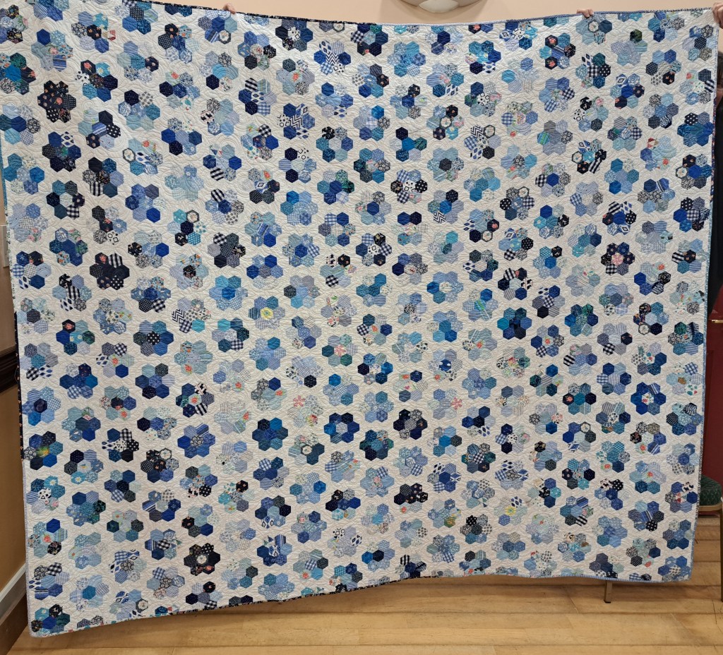 The show and tell never disappoints. Bright colours were the order of the day to banish the grey skies. Bernie showed off a vibrant shadow quilt. Eilís showed her latest layer cake quilt. Everyone was amazed at Jacinta’s wonderful hexagon quilt which was all hand stitched. Anne Maloney had a happy valentines day when she was gifted two delightful hearts.