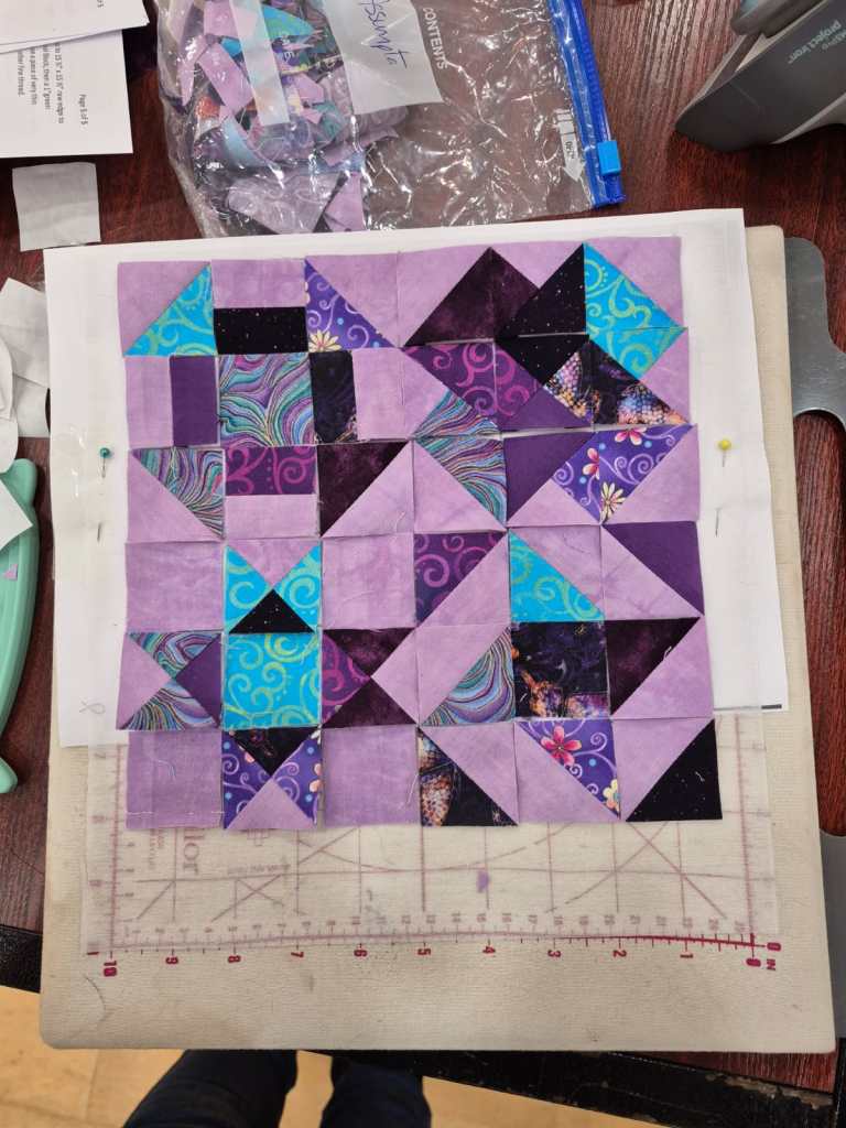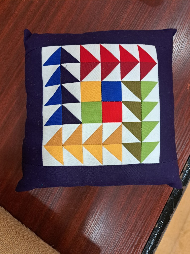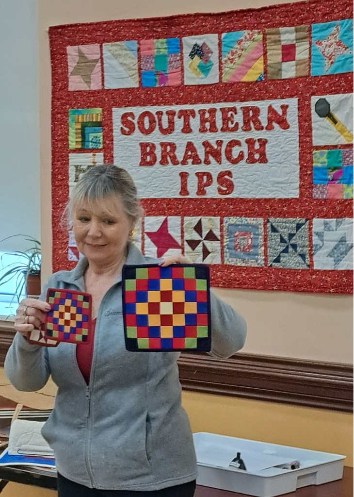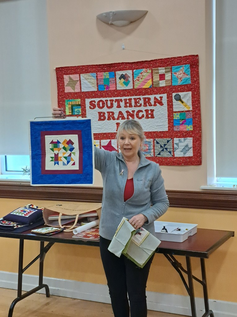 Following the meeting Lyn conducted a full workshop for the afternoon on a method of making a mini mosaic quilt block which was enjoyed by all who made some lovely blocks. Lyn showed both a completed quilt in this style and also samples and a cushion.