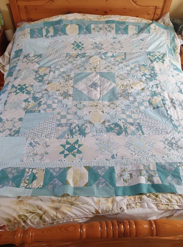 Eilís Watson – I’ve been primarily working on Bonnie Hunter’s mystery quilt ‘Unity’ #unityquiltalong. We’re currently on Round 7. This border will feature 34 of the 8.5” block (pictured). I’ve also included a picture of my progress to date.