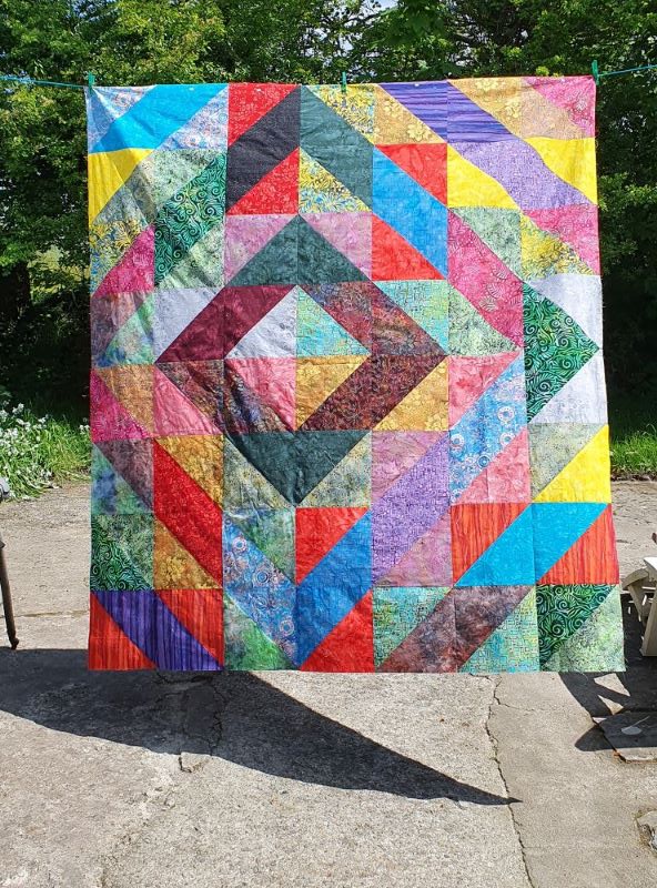 Eilís Watson – ‘Stained-glass affect’: I finished this quilt last weekend. Stacked nine fat-quarters on top of each other, made 2 horizontal cuts and 2 vertical cuts. I then moved the fabrics around so that each ‘block’ had 9 different colours and added black sashing between all the pieces.