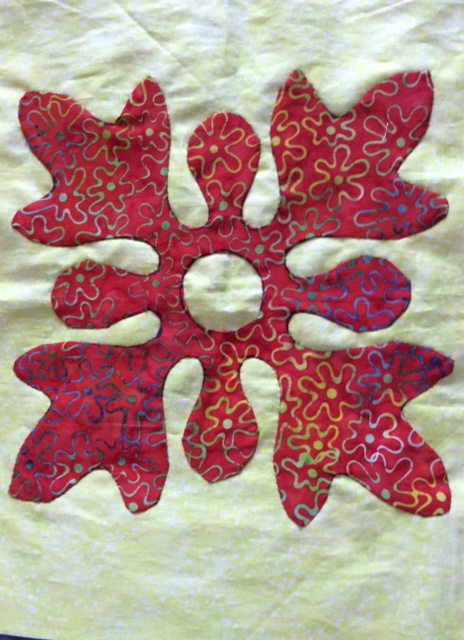 Marie Sprott – Below left is my appliqué from Sandra’s class earlier in the year. Finished at last but not sure what to do with it, either a small wall hanging or cushion cover. I also made this Greek Cross block for a cushion out of scraps last Monday. Just for something to do. I have also knitted two tea cosies and finished a jumper I started last year. I have found eborrow books great as well, especially the eaudio ones. I just plug into my book and am read to while sewing, knitting, ironing etc… Great!!