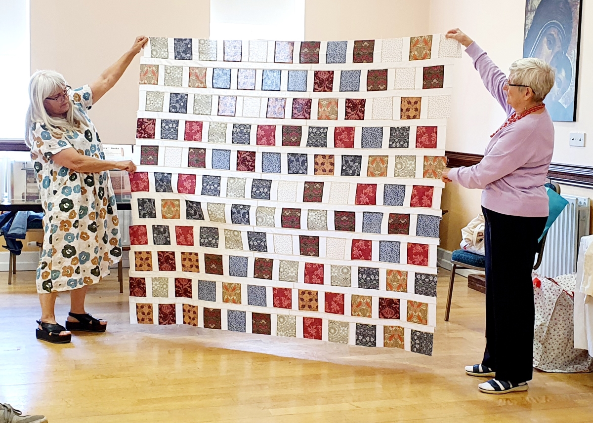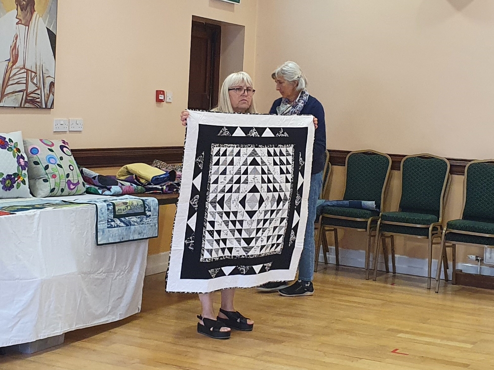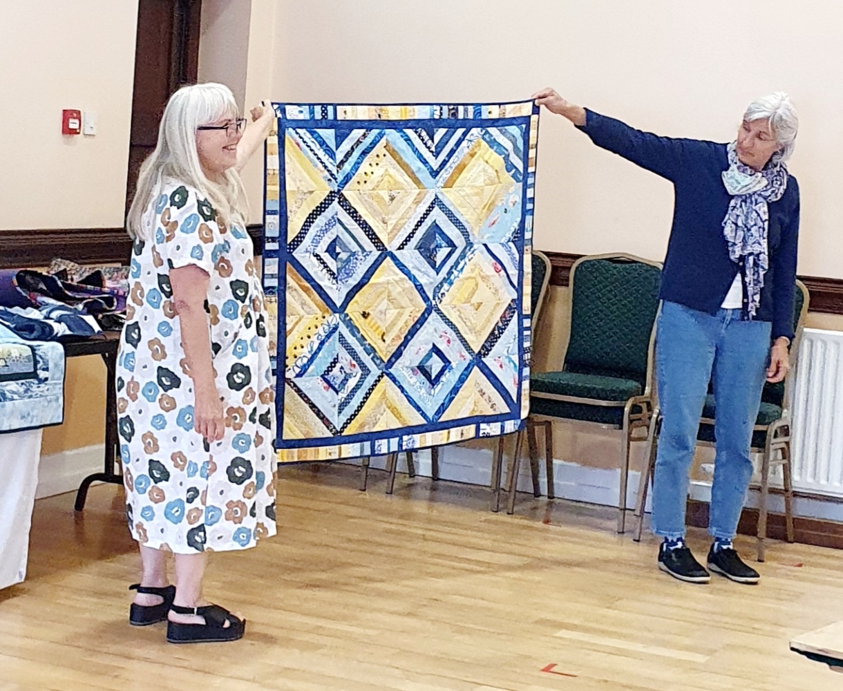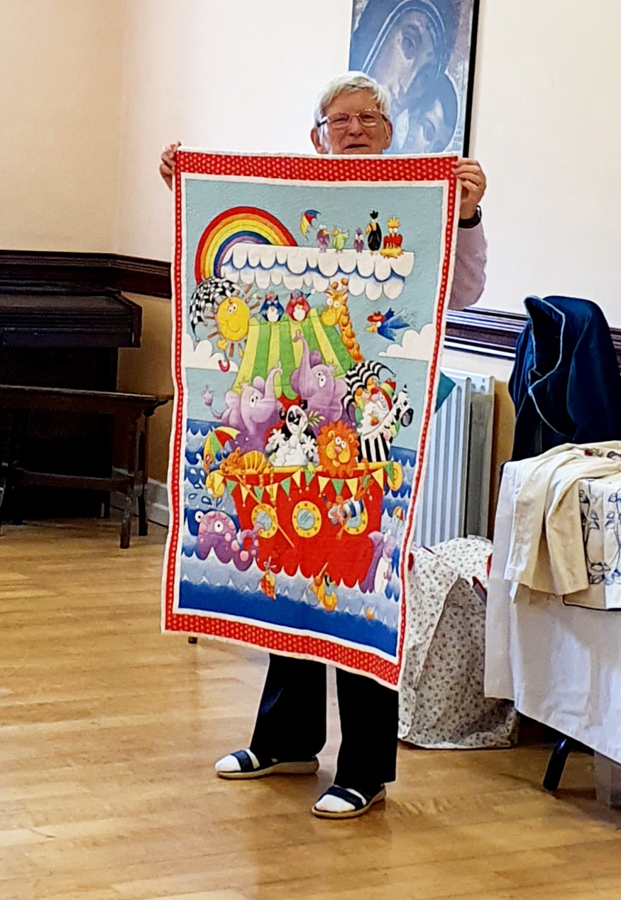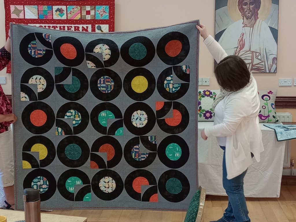 Marie showed us her double wedding ring quilt. Stitched mostly during occasional travels over many years, she recently finished the top. Mary Palmer’s quilting magic finished it off brilliantly.