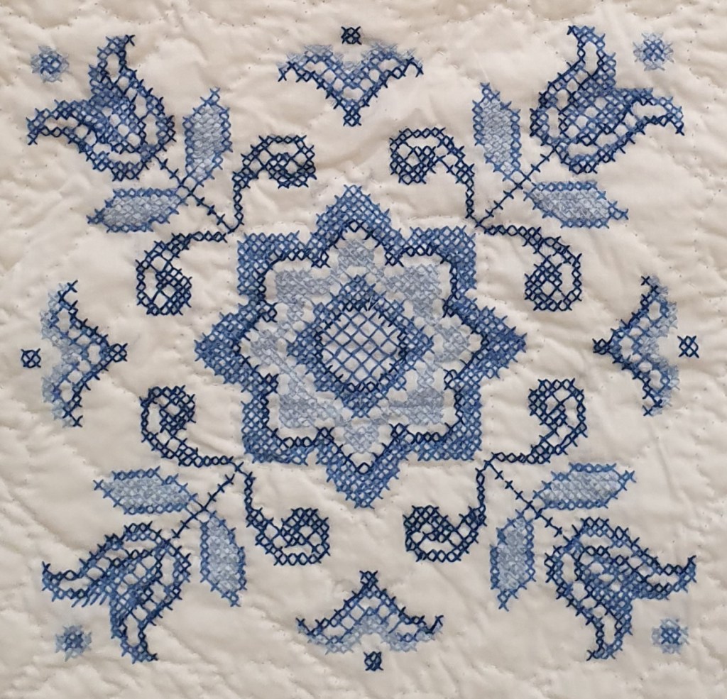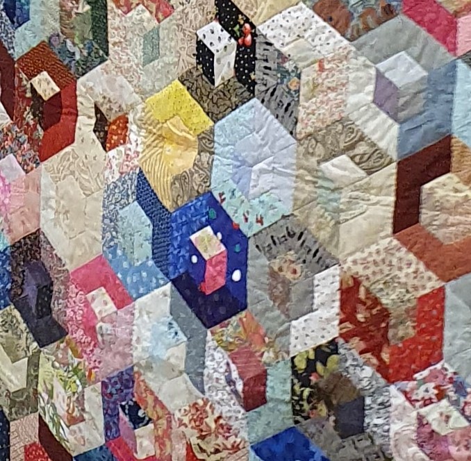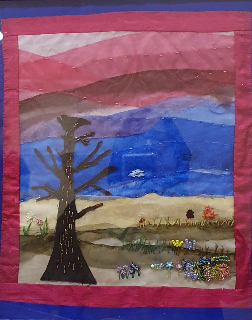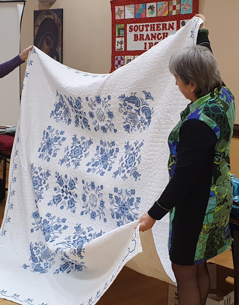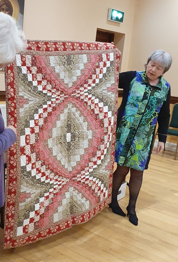 After the business of the AGM, our own Sheila Devereux gave us a real treat as she talked us through some of her work. The vast majority of Sheila’s work is hand pieced and hand quilted, and we marvelled at the breadth of styles and techniques used. Here is a taste of her beautiful work…