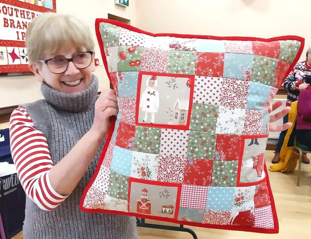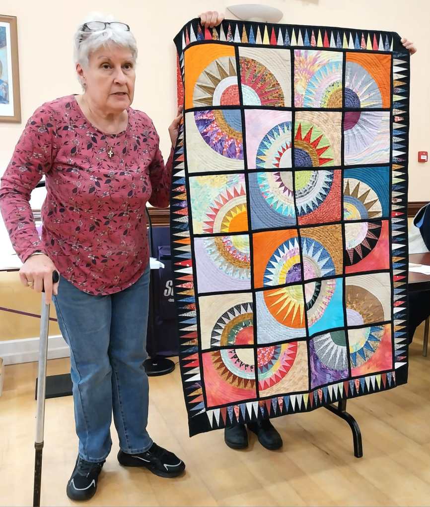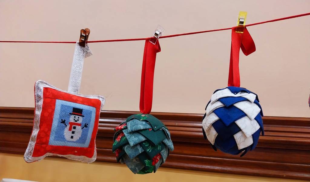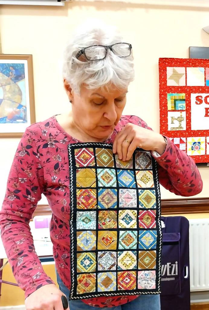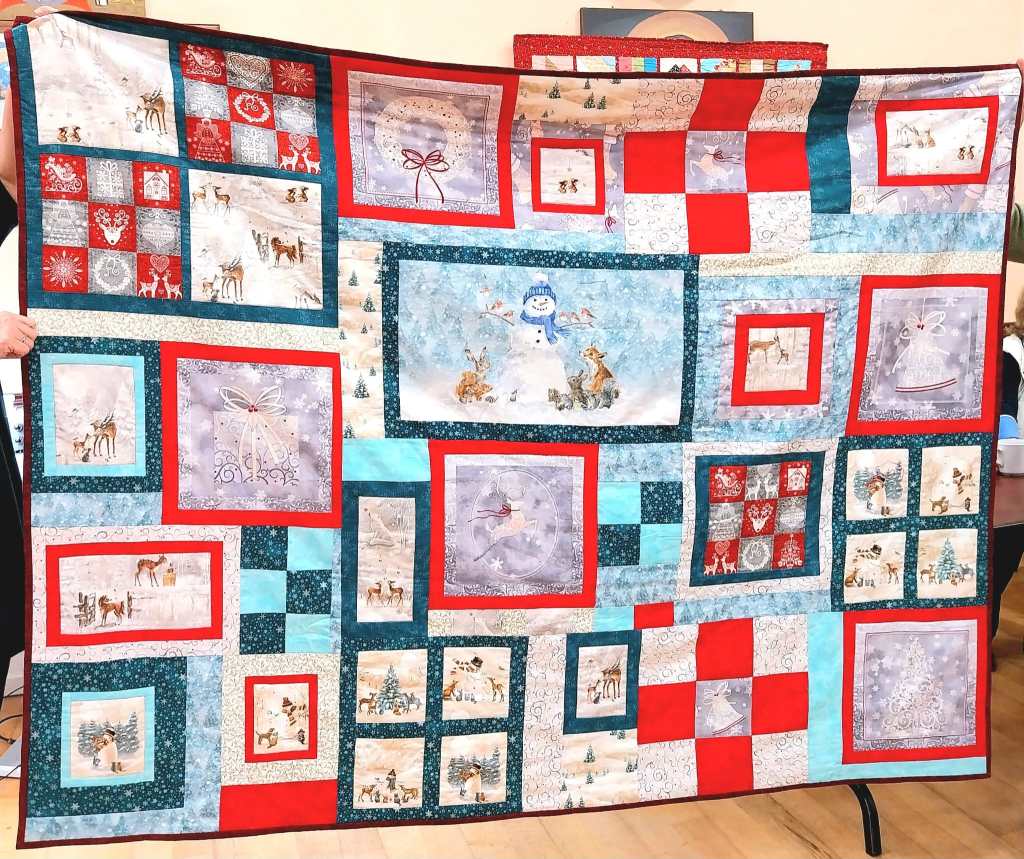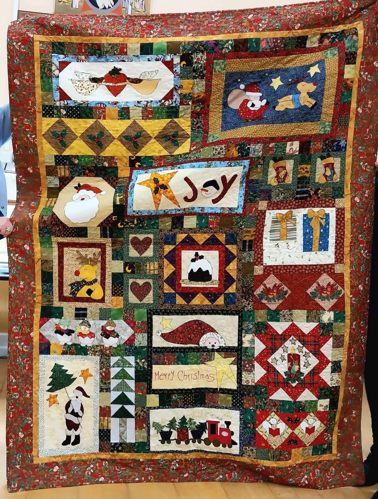 A very festive meeting took place on 13th December. There was lots of merriment to be had and some mince pies consumed amid the chats while browsing Lismore Quilts pop up shop and viewing the Christmas tree decorations on display. Following the success of last years decoration swap this year there were even more entries and a huge array of different styles and techniques. We were joined by Executive Chairperson Mary Bell, who travelled down from Dublin. SewEzi tables were exhibited by Yvonne and Clare who was also taking orders. Any one interested in the tables can contact Yvonne at eweziuk@gmail.com Ann Prendergast acted as our quizmaster for a festive fun table quiz. After the quiz Mrs Claus aided by a willing elf distributed a gift for everyone. followed by an outstanding display for our last show and tell of the year.
