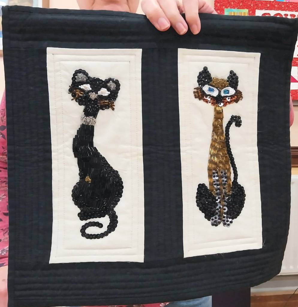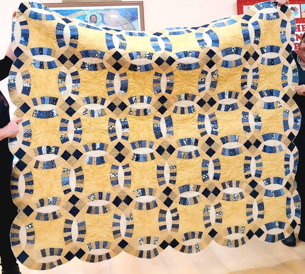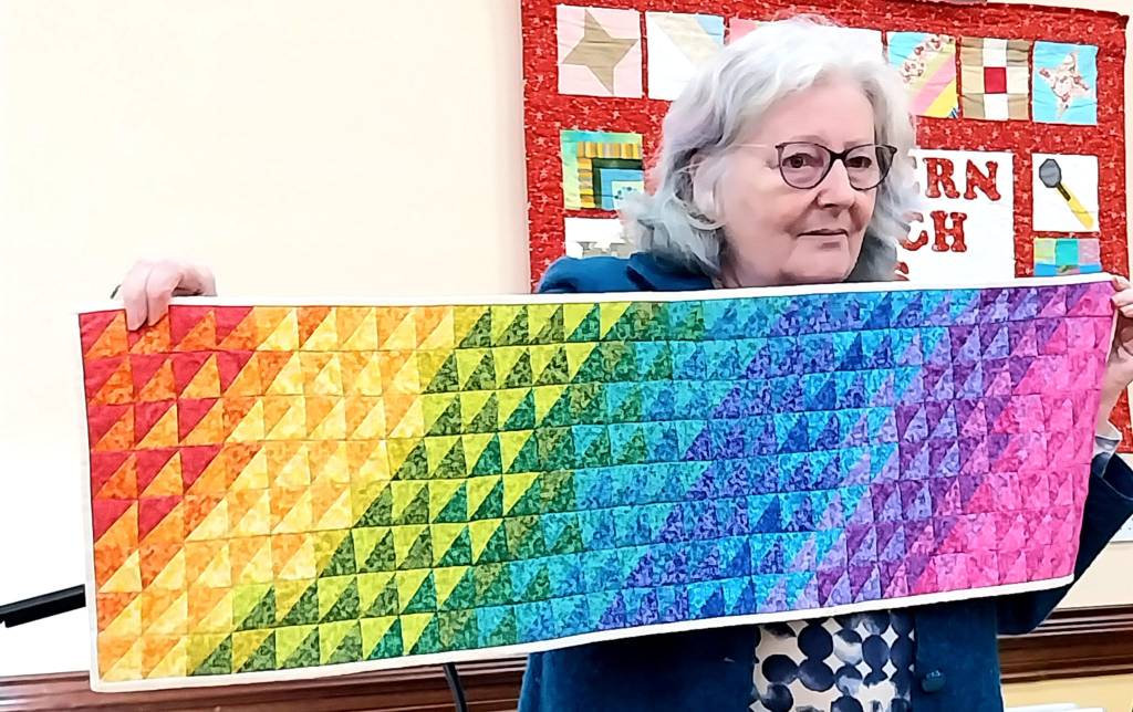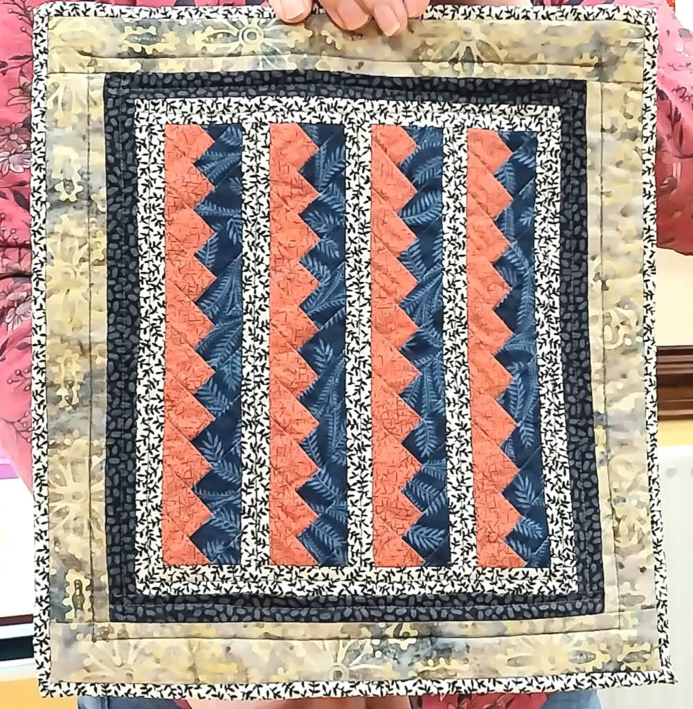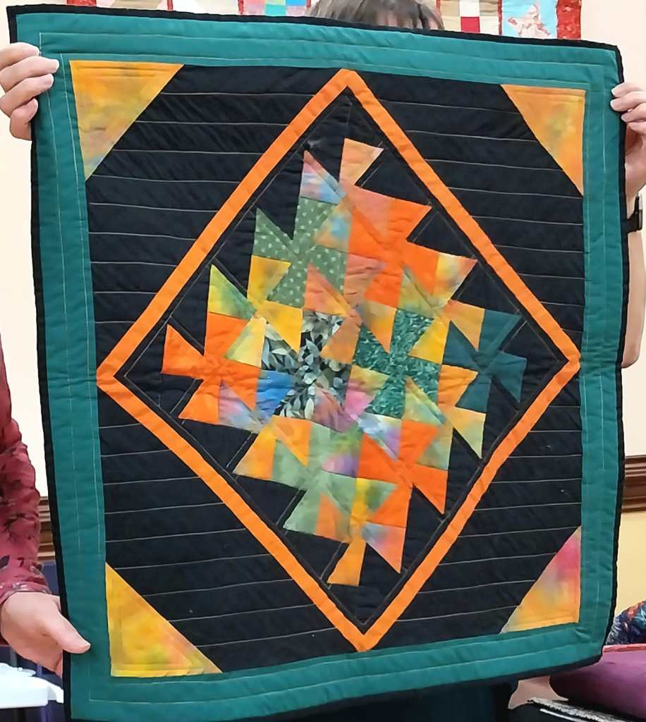 A very festive meeting took place on 13th December. There was lots of merriment to be had and some mince pies consumed amid the chats while browsing Lismore Quilts pop up shop and viewing the Christmas tree decorations on display. Following the success of last years decoration swap this year there were even more entries and a huge array of different styles and techniques. We were joined by Executive Chairperson Mary Bell, who travelled down from Dublin. SewEzi tables were exhibited by Yvonne and Clare who was also taking orders. Any one interested in the tables can contact Yvonne at eweziuk@gmail.com Ann Prendergast acted as our quizmaster for a festive fun table quiz. After the quiz Mrs Claus aided by a willing elf distributed a gift for everyone. followed by an outstanding display for our last show and tell of the year.