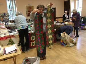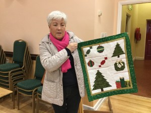 Patricia’s Block of the Month projectOur very professional MC and quiz master, Ann PrendergastJane has Christmas all tied up!The 3 degrees! (They are hotter than that)Princess Laya….MaiSheila between two messers! Assumpta and SiobhanBernie ready for the quiz!Marie O Leary with her kaleidoscope quiltMarie’s stack and wack quiltMoya’s cake mix quilt