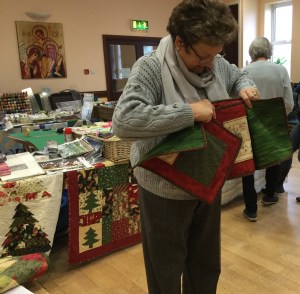 And this is just the back of Cathy’s quilt!Ann’s Christmas cushionMairead with her Christmas magazine rack and toilet roll holderFrances behind her baby quilt!Sheila’s stack and wack in Christmas colorsSheila’s bargelloJust look at those points!!Mary O’Regan and her Pom Pom Christmas wreathMary’s lit up swirl treeAnd not so seasonal!Christmas tree skirt and Cora behind it!Cora’s place matsAnd runnersThe Concentration!!I swear Ann, it was non alcoholic mulled wine!