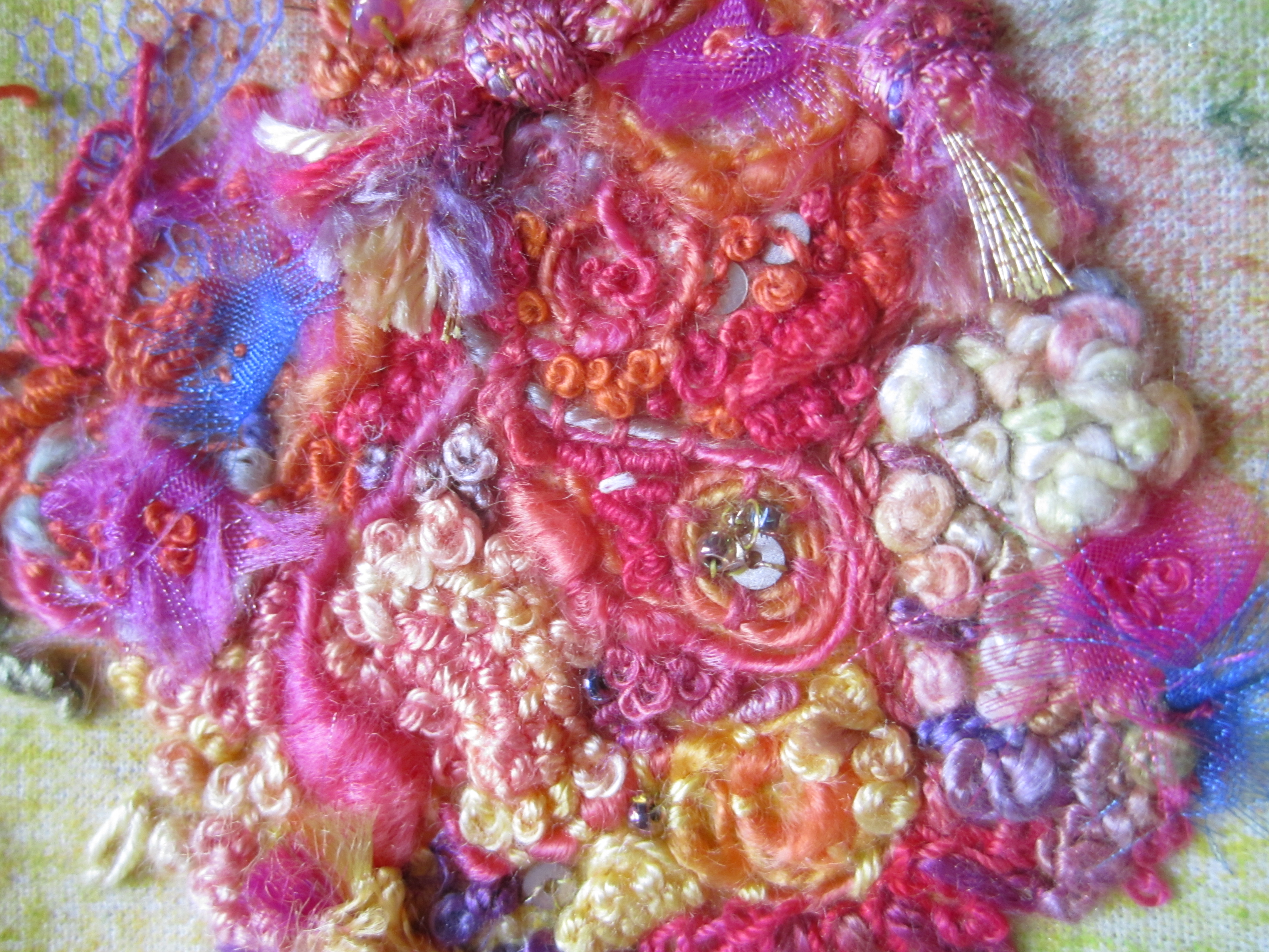 She states “I work mostly using the technique of free-machine embroidery often stitching onto a soluble background which is later dissolved away to create a lace-like effect, or I combine my stitching with my own hand-dyed silks and velvets. I create individual wall pieces, garments and accessories. I teach workshops in free-machine embroidery and related textile techniques and enjoy working to commission.”